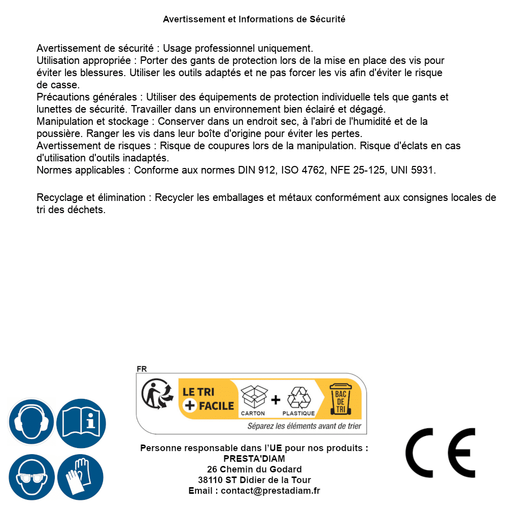 | AVERTISSEMENT et SECURITE | Identification de la personne responsable dans l’UE : Nom : PRESTA'DIAM. Adresse : 26 Chemin du Godard, 38110 ST Didier de la Tour (France). Email : contact@prestadiam.fr. |