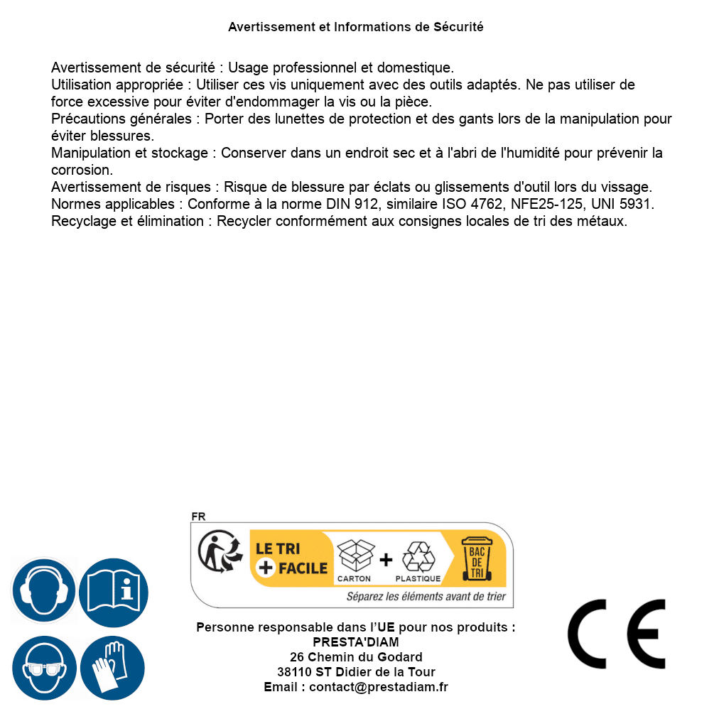 | AVERTISSEMENT et SECURITE | Identification de la personne responsable dans l’UE : Nom : PRESTA'DIAM. Adresse : 26 Chemin du Godard, 38110 ST Didier de la Tour (France). Email : contact@prestadiam.fr. |