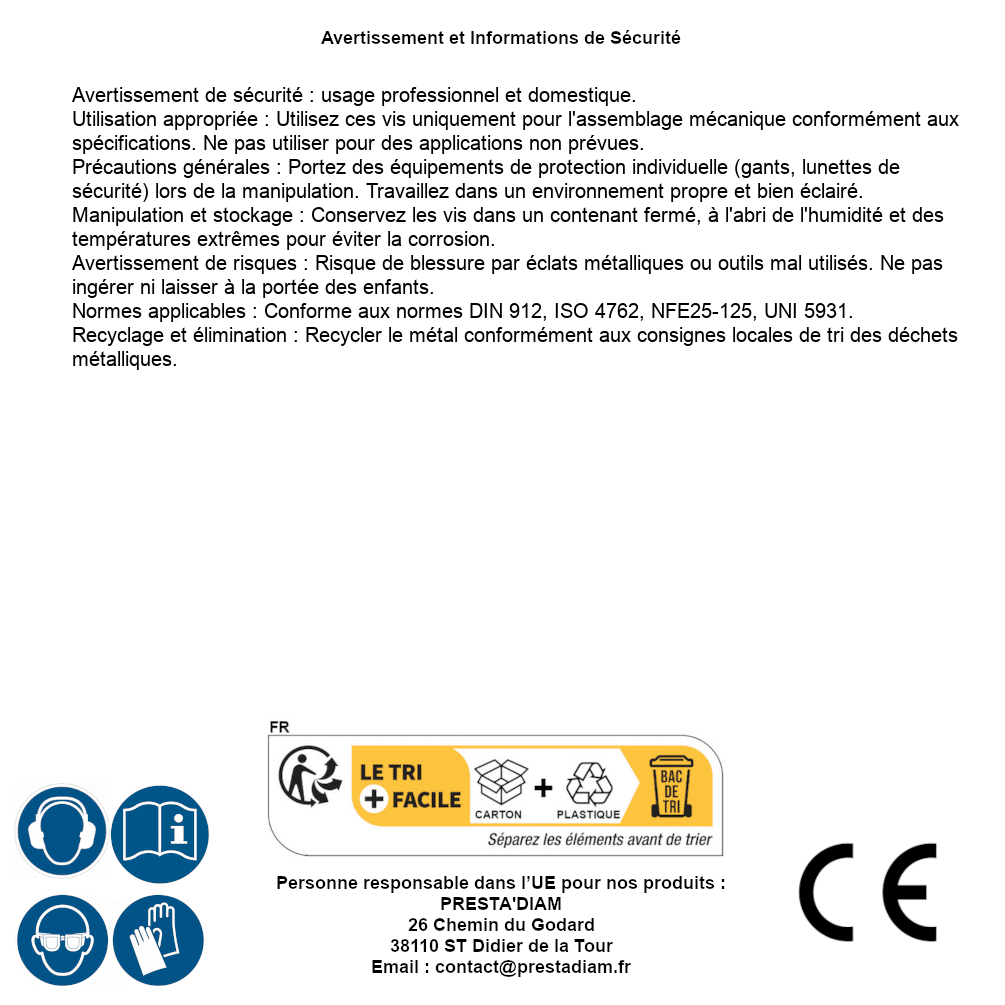| AVERTISSEMENT et SECURITE | Identification de la personne responsable dans l’UE : Nom : PRESTA'DIAM. Adresse : 26 Chemin du Godard, 38110 ST Didier de la Tour (France). Email : contact@prestadiam.fr. |