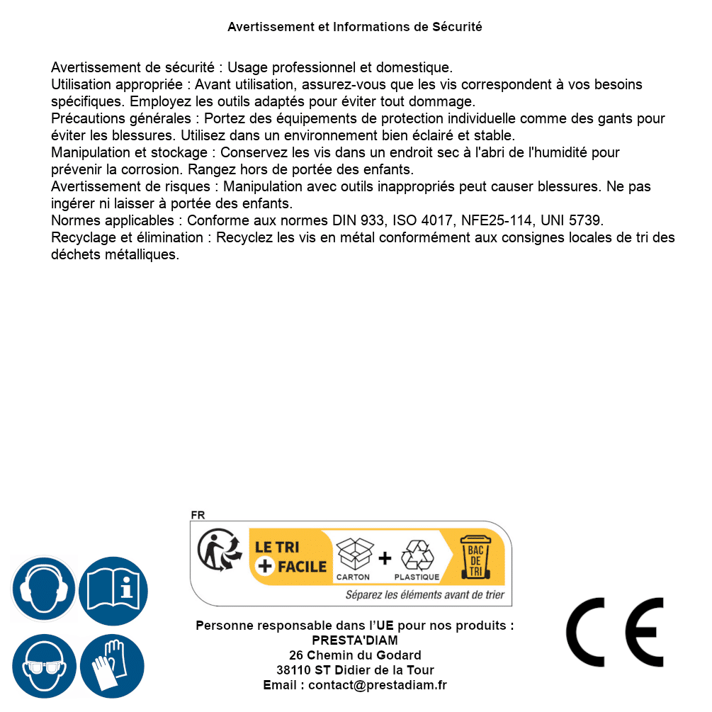 | AVERTISSEMENT et SECURITE | Identification de la personne responsable dans l’UE : Nom : PRESTA'DIAM. Adresse : 26 Chemin du Godard, 38110 ST Didier de la Tour (France). Email : contact@prestadiam.fr. |