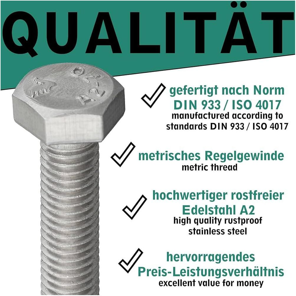 Ce lot de 50 vis à métaux à tête hexagonale est conçu pour des assemblages solides et durables. Avec un filetage total de 8 mm de diamètre et une longueur de 35 mm, ces vis en inox A2 répondent à la norme DIN 933, garantissant une qualité et une compatibilité optimales. Elles conviennent parfaitement aux applications industrielles et de construction nécessitant une fixation résistante à la corrosion.