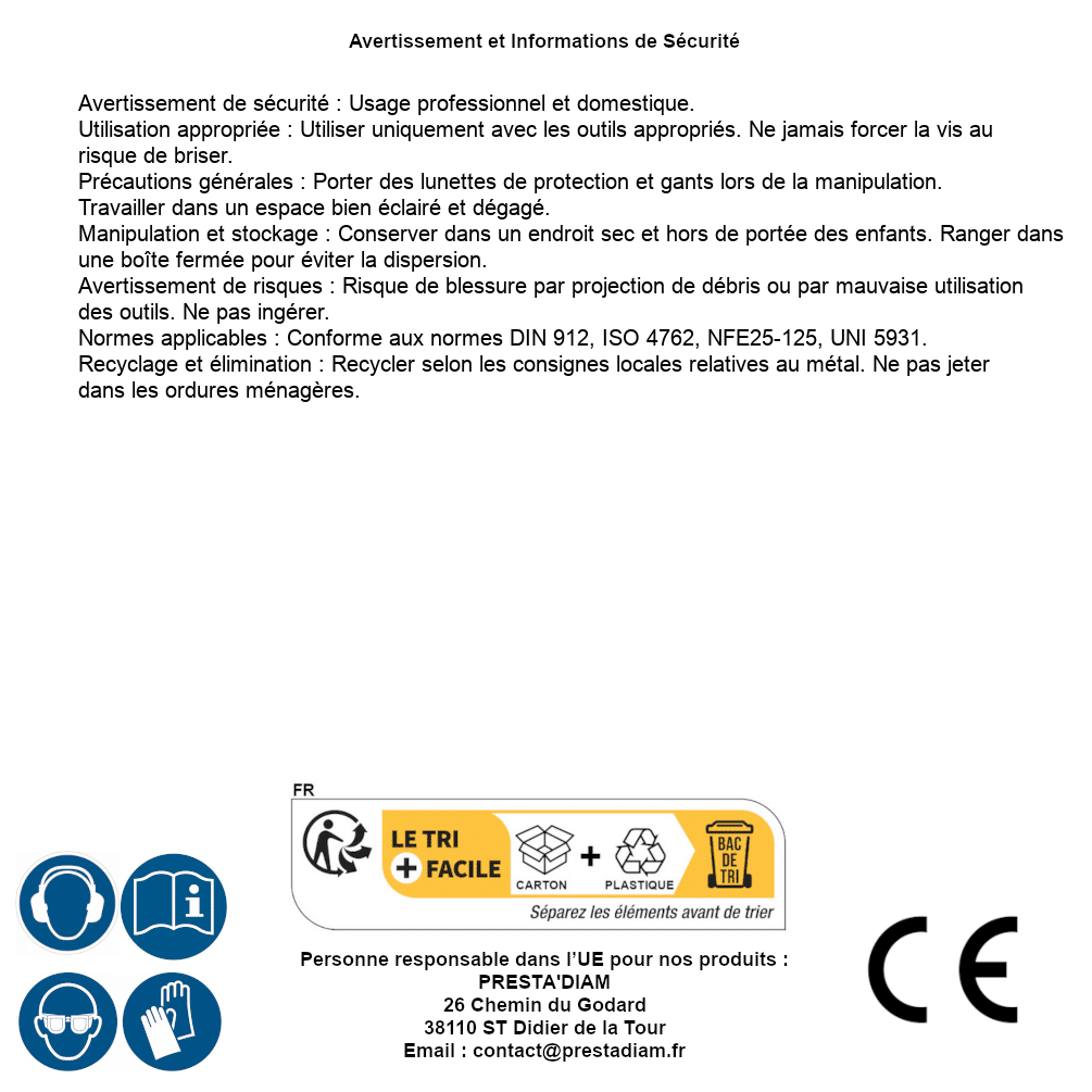 | AVERTISSEMENT et SECURITE | Identification de la personne responsable dans l’UE : Nom : PRESTA'DIAM. Adresse : 26 Chemin du Godard, 38110 ST Didier de la Tour (France). Email : contact@prestadiam.fr. |
