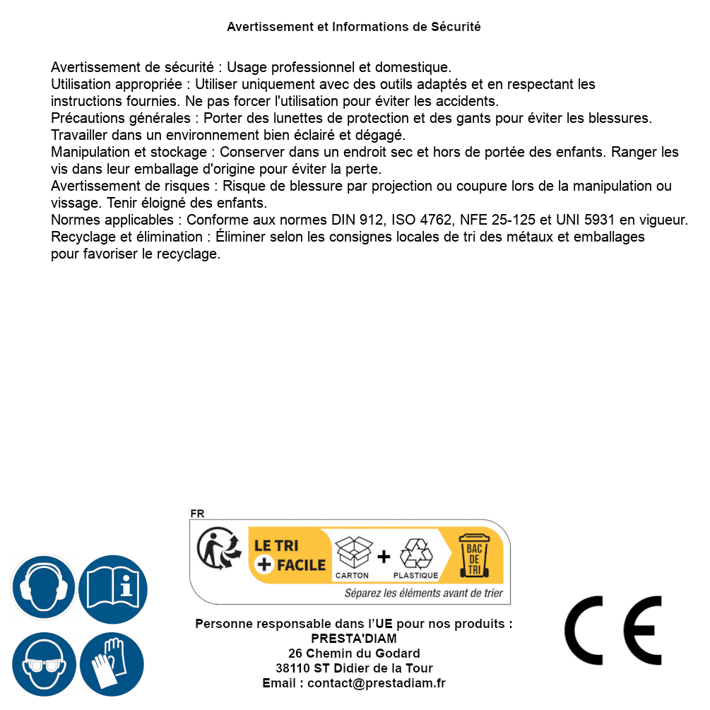 | AVERTISSEMENT et SECURITE | Identification de la personne responsable dans l’UE : Nom : PRESTA'DIAM. Adresse : 26 Chemin du Godard, 38110 ST Didier de la Tour (France). Email : contact@prestadiam.fr. |