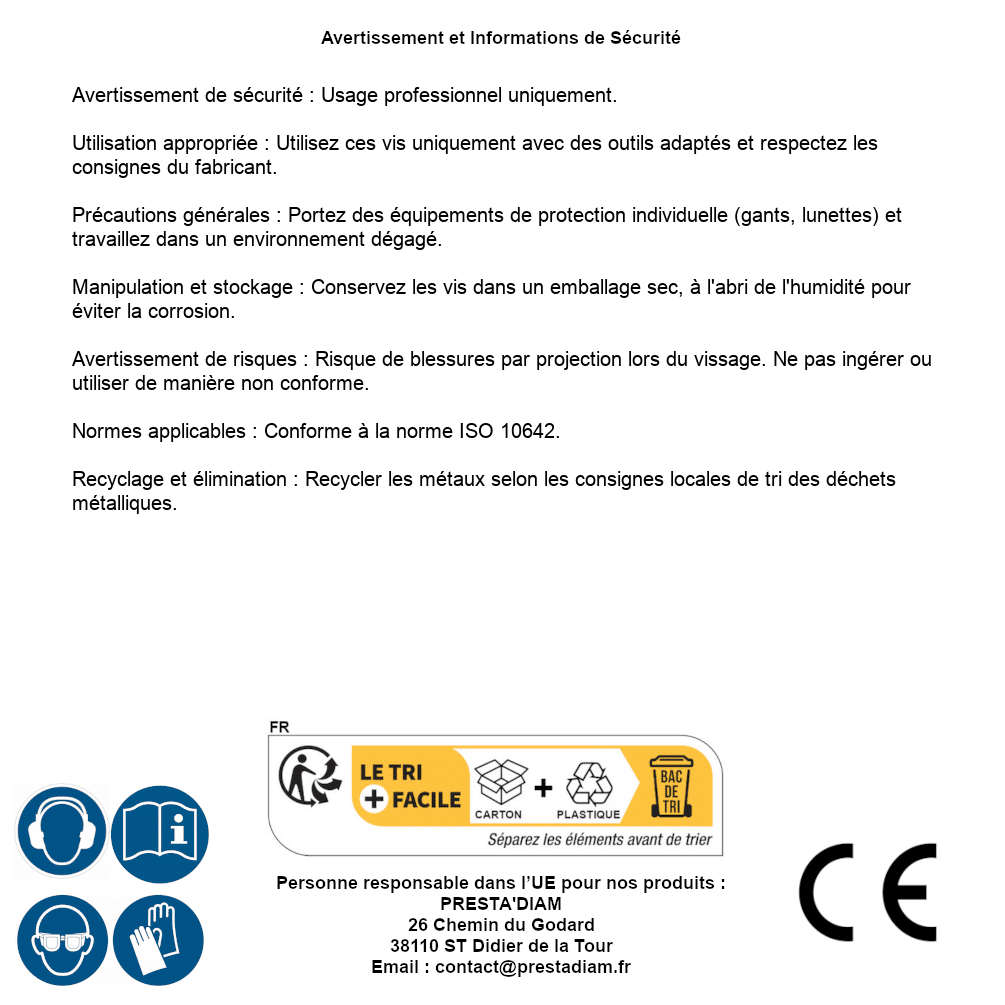 | AVERTISSEMENT et SECURITE | Identification de la personne responsable dans l’UE : Nom : PRESTA'DIAM. Adresse : 26 Chemin du Godard, 38110 ST Didier de la Tour (France). Email : contact@prestadiam.fr. |