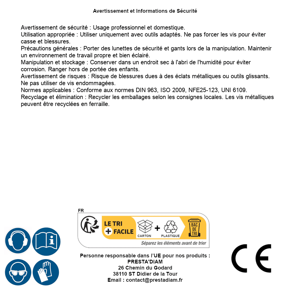 | AVERTISSEMENT et SECURITE | Identification de la personne responsable dans l’UE : Nom : PRESTA'DIAM. Adresse : 26 Chemin du Godard, 38110 ST Didier de la Tour (France). Email : contact@prestadiam.fr. |