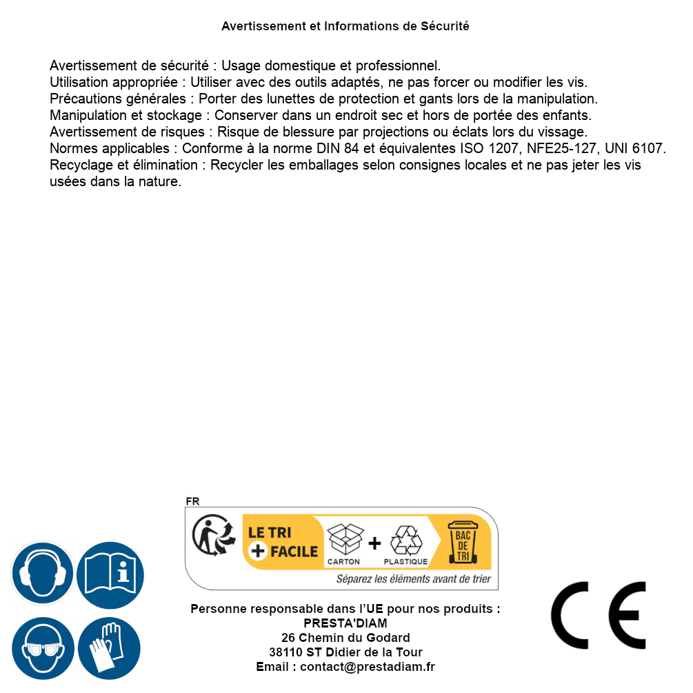 | AVERTISSEMENT et SECURITE | Identification de la personne responsable dans l’UE : Nom : PRESTA'DIAM. Adresse : 26 Chemin du Godard, 38110 ST Didier de la Tour (France). Email : contact@prestadiam.fr. |