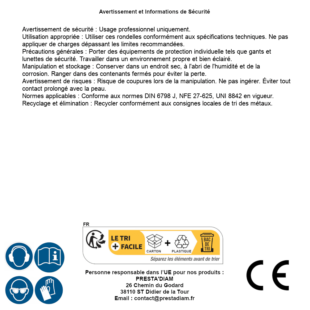 | AVERTISSEMENT et SECURITE | Identification de la personne responsable dans l’UE : Nom : PRESTA'DIAM. Adresse : 26 Chemin du Godard, 38110 ST Didier de la Tour (France). Email : contact@prestadiam.fr. |