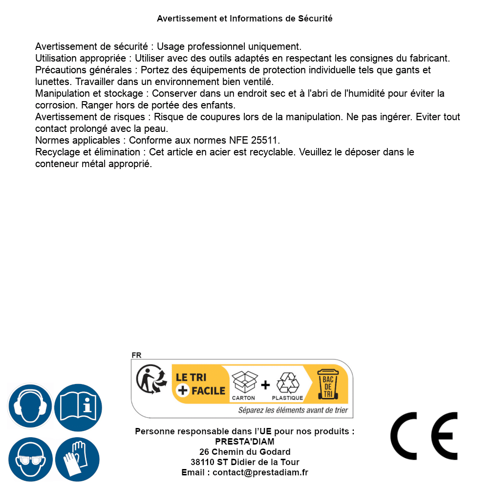 | AVERTISSEMENT et SECURITE | Identification de la personne responsable dans l’UE : Nom : PRESTA'DIAM. Adresse : 26 Chemin du Godard, 38110 ST Didier de la Tour (France). Email : contact@prestadiam.fr. |