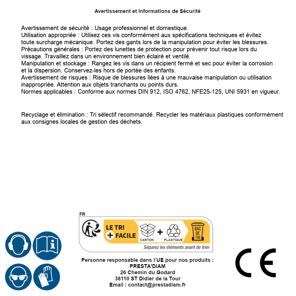 | AVERTISSEMENT et SECURITE | Identification de la personne responsable dans l’UE : Nom : PRESTA'DIAM. Adresse : 26 Chemin du Godard, 38110 ST Didier de la Tour (France). Email : contact@prestadiam.fr. |