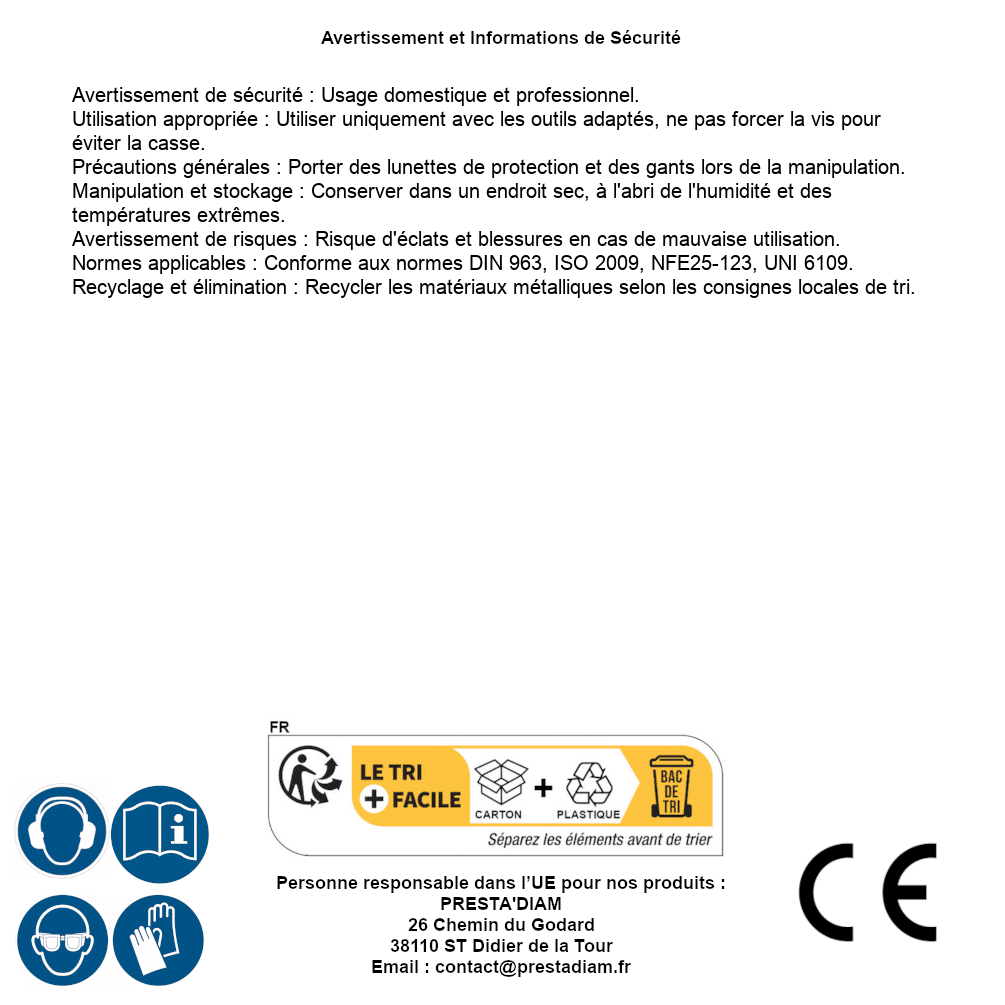 | AVERTISSEMENT et SECURITE | Identification de la personne responsable dans l’UE : Nom : PRESTA'DIAM. Adresse : 26 Chemin du Godard, 38110 ST Didier de la Tour (France). Email : contact@prestadiam.fr. |