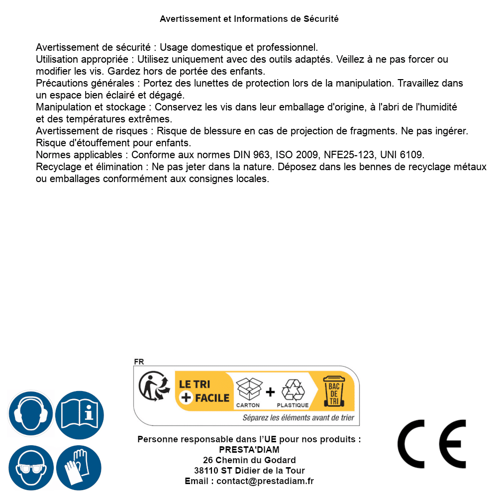 | AVERTISSEMENT et SECURITE | Identification de la personne responsable dans l’UE : Nom : PRESTA'DIAM. Adresse : 26 Chemin du Godard, 38110 ST Didier de la Tour (France). Email : contact@prestadiam.fr. |
