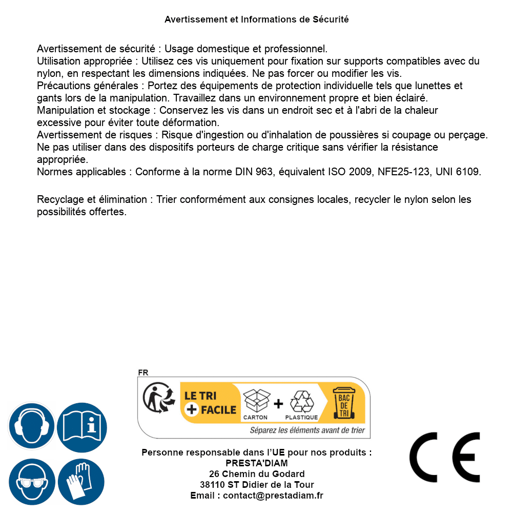 | AVERTISSEMENT et SECURITE | Identification de la personne responsable dans l’UE : Nom : PRESTA'DIAM. Adresse : 26 Chemin du Godard, 38110 ST Didier de la Tour (France). Email : contact@prestadiam.fr. |