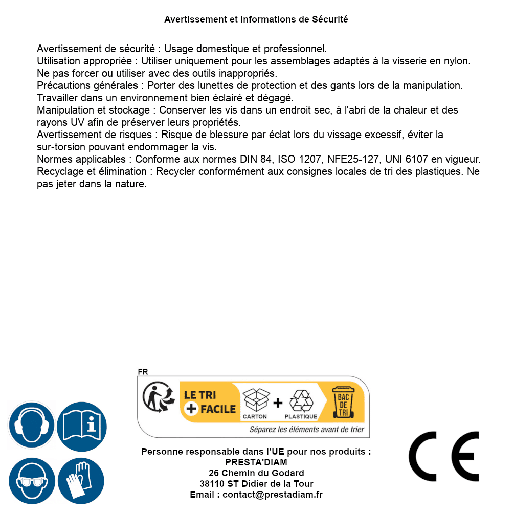 | AVERTISSEMENT et SECURITE | Identification de la personne responsable dans l’UE : Nom : PRESTA'DIAM. Adresse : 26 Chemin du Godard, 38110 ST Didier de la Tour (France). Email : contact@prestadiam.fr. |