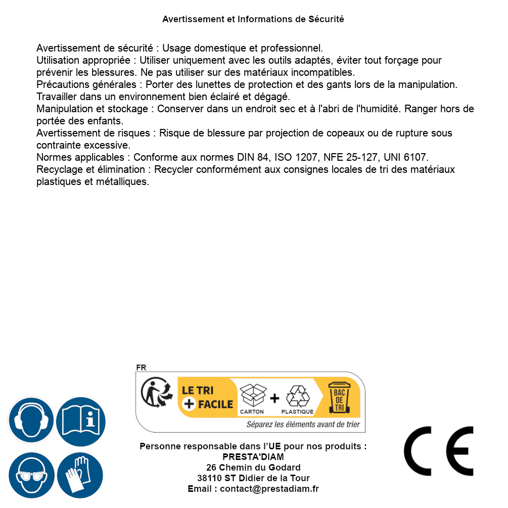 | AVERTISSEMENT et SECURITE | Identification de la personne responsable dans l’UE : Nom : PRESTA'DIAM. Adresse : 26 Chemin du Godard, 38110 ST Didier de la Tour (France). Email : contact@prestadiam.fr. |