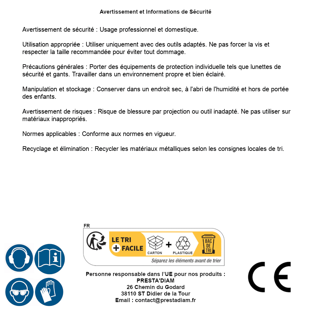 | AVERTISSEMENT et SECURITE | Identification de la personne responsable dans l’UE : Nom : PRESTA'DIAM. Adresse : 26 Chemin du Godard, 38110 ST Didier de la Tour (France). Email : contact@prestadiam.fr. |