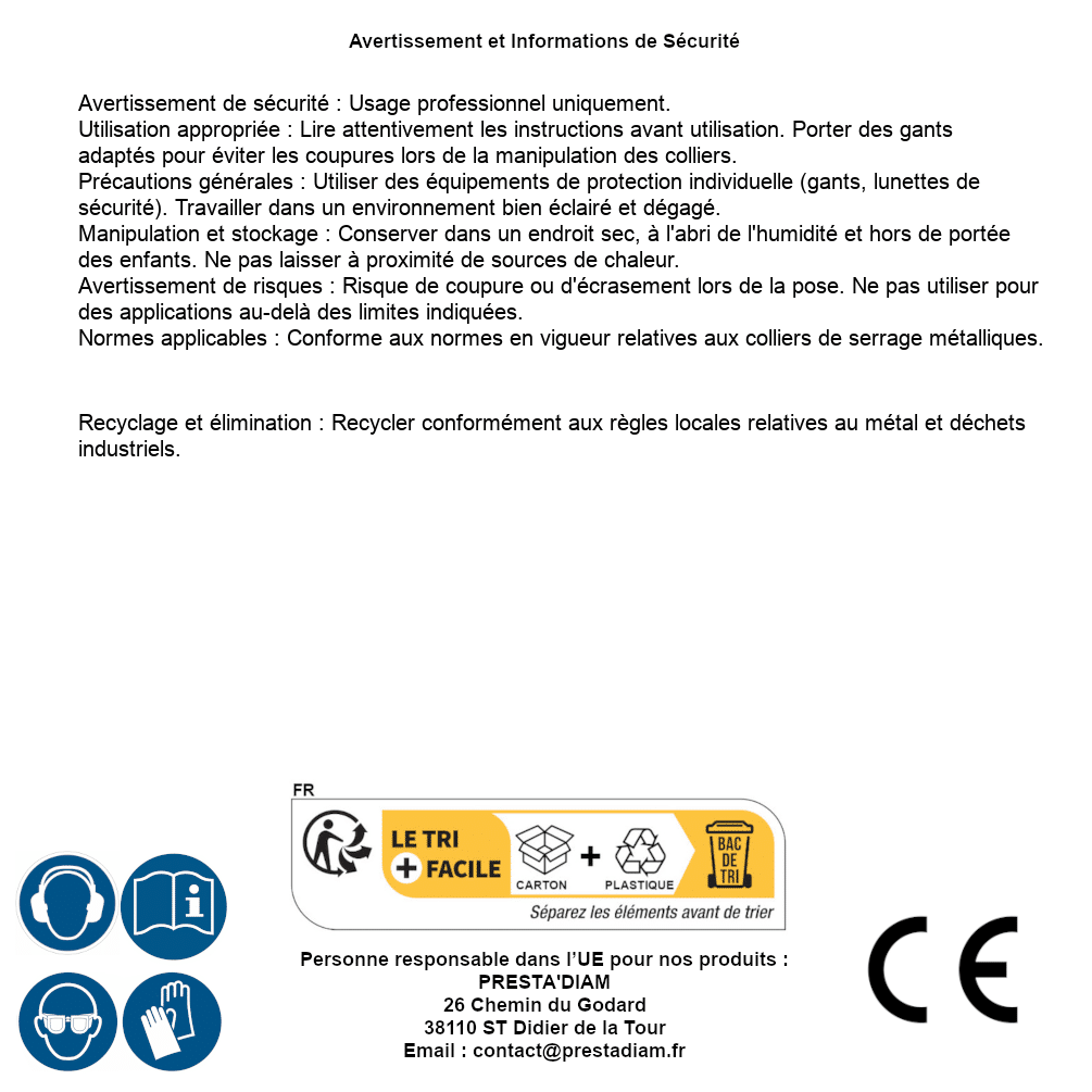 | AVERTISSEMENT et SECURITE | Identification de la personne responsable dans l’UE : Nom : PRESTA'DIAM. Adresse : 26 Chemin du Godard, 38110 ST Didier de la Tour (France). Email : contact@prestadiam.fr. |