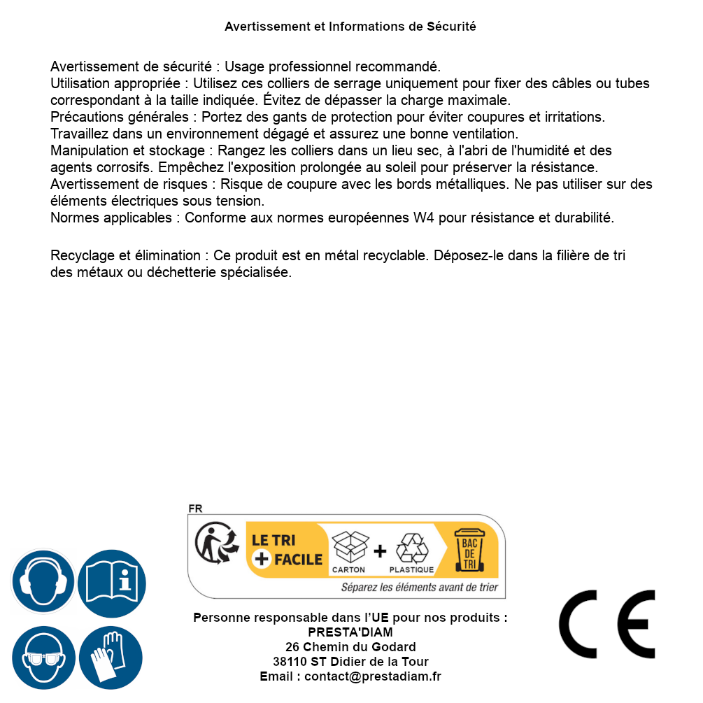 | AVERTISSEMENT et SECURITE | Identification de la personne responsable dans l’UE : Nom : PRESTA'DIAM. Adresse : 26 Chemin du Godard, 38110 ST Didier de la Tour (France). Email : contact@prestadiam.fr. |