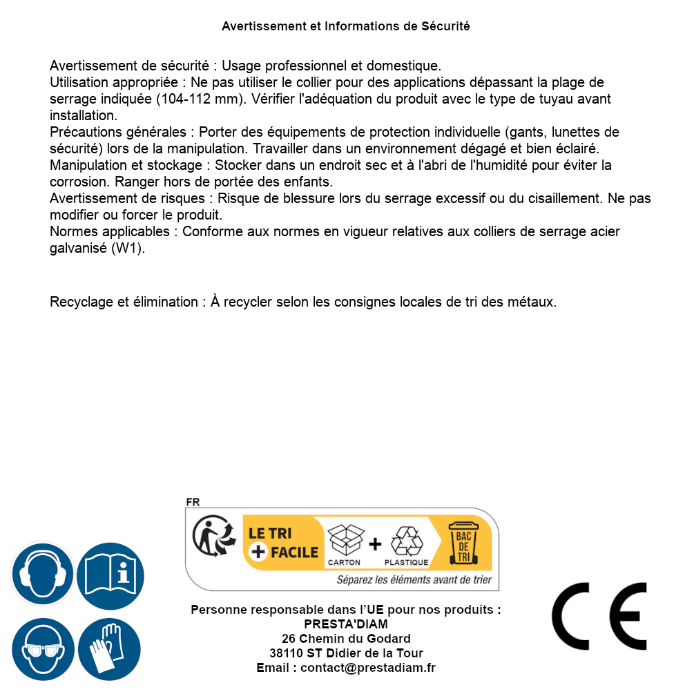 | AVERTISSEMENT et SECURITE | Identification de la personne responsable dans l’UE : Nom : PRESTA'DIAM. Adresse : 26 Chemin du Godard, 38110 ST Didier de la Tour (France). Email : contact@prestadiam.fr. |
