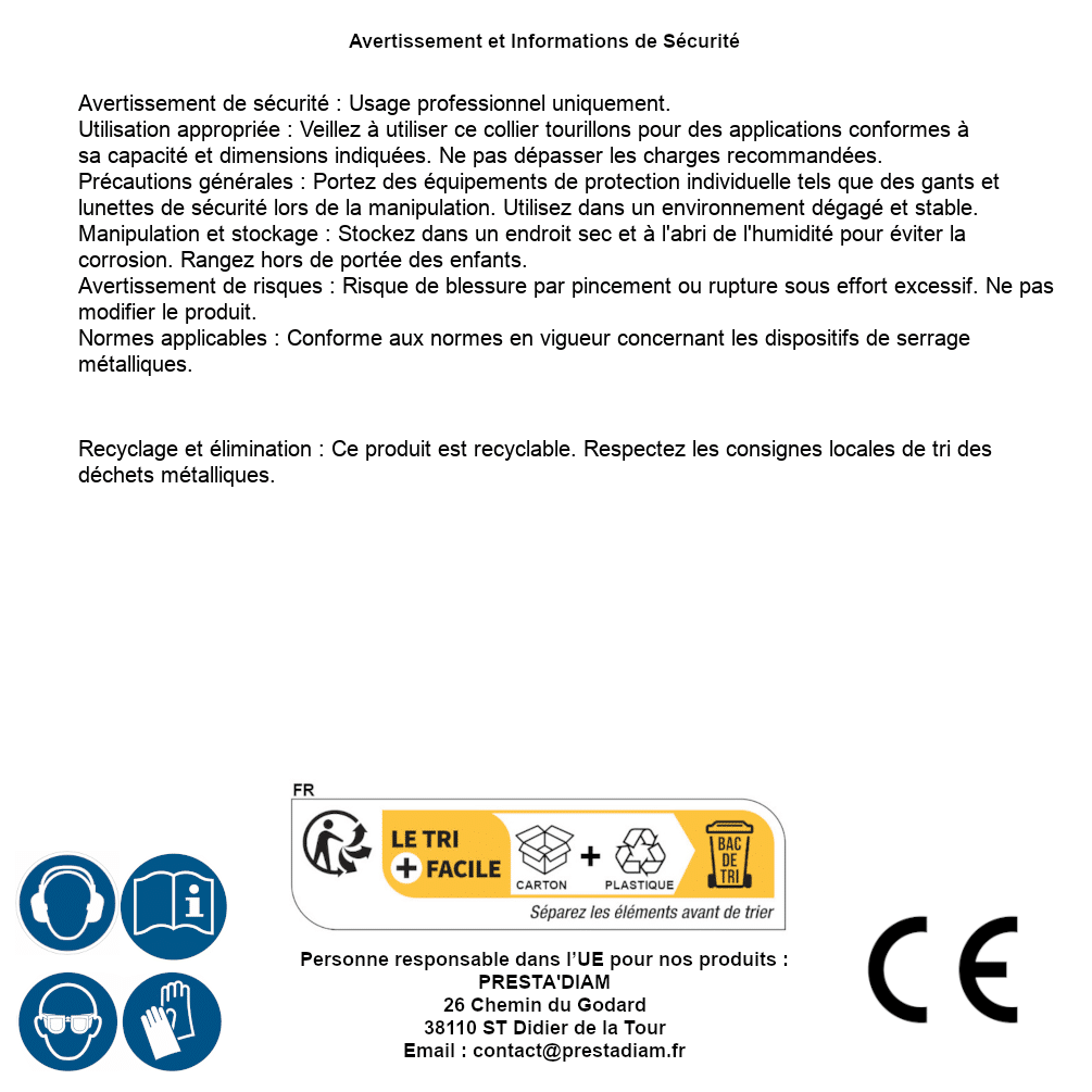 | AVERTISSEMENT et SECURITE | Identification de la personne responsable dans l’UE : Nom : PRESTA'DIAM. Adresse : 26 Chemin du Godard, 38110 ST Didier de la Tour (France). Email : contact@prestadiam.fr. |