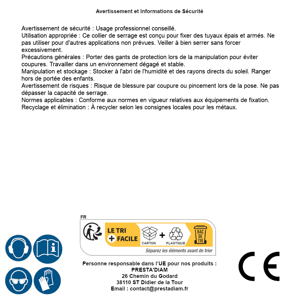| AVERTISSEMENT et SECURITE | Identification de la personne responsable dans l’UE : Nom : PRESTA'DIAM. Adresse : 26 Chemin du Godard, 38110 ST Didier de la Tour (France). Email : contact@prestadiam.fr. |
