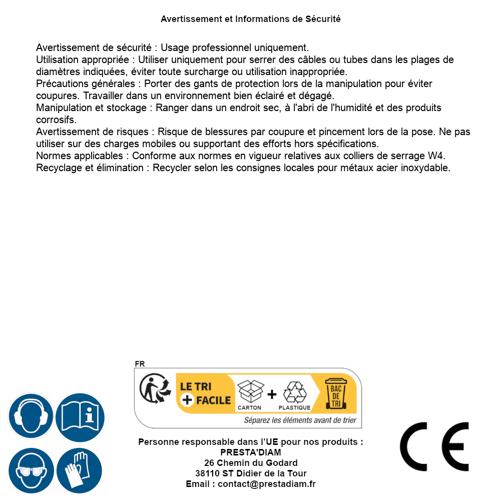 | AVERTISSEMENT et SECURITE | Identification de la personne responsable dans l’UE : Nom : PRESTA'DIAM. Adresse : 26 Chemin du Godard, 38110 ST Didier de la Tour (France). Email : contact@prestadiam.fr. |