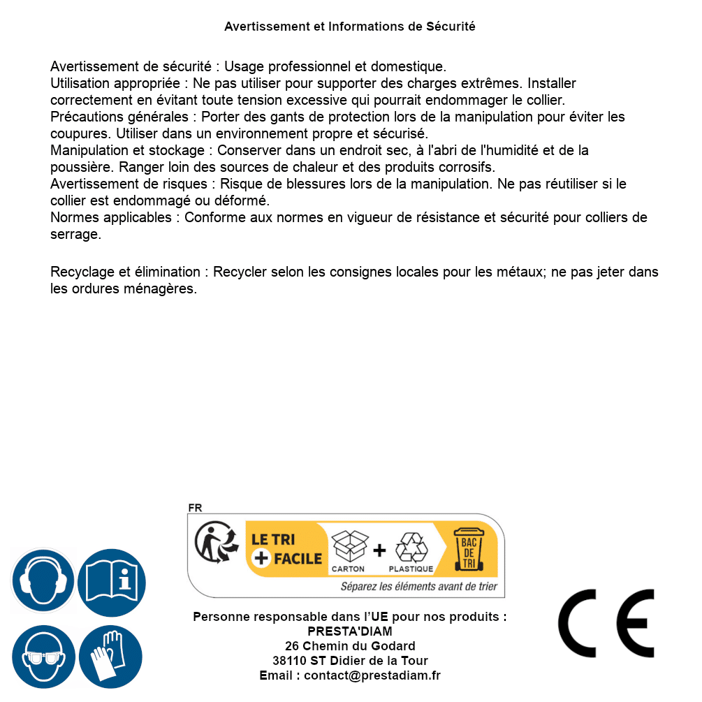 | AVERTISSEMENT et SECURITE | Identification de la personne responsable dans l’UE : Nom : PRESTA'DIAM. Adresse : 26 Chemin du Godard, 38110 ST Didier de la Tour (France). Email : contact@prestadiam.fr. |