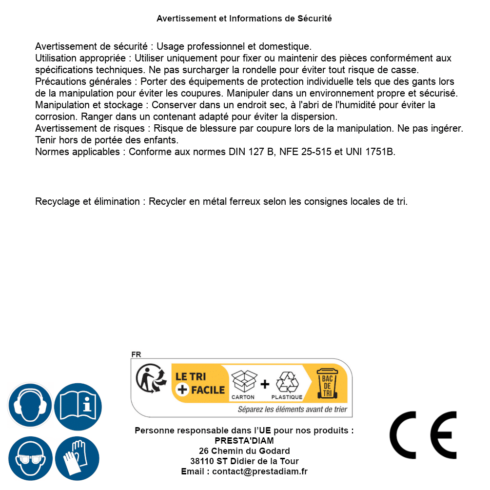 | AVERTISSEMENT et SECURITE | Identification de la personne responsable dans l’UE : Nom : PRESTA'DIAM. Adresse : 26 Chemin du Godard, 38110 ST Didier de la Tour (France). Email : contact@prestadiam.fr. |
