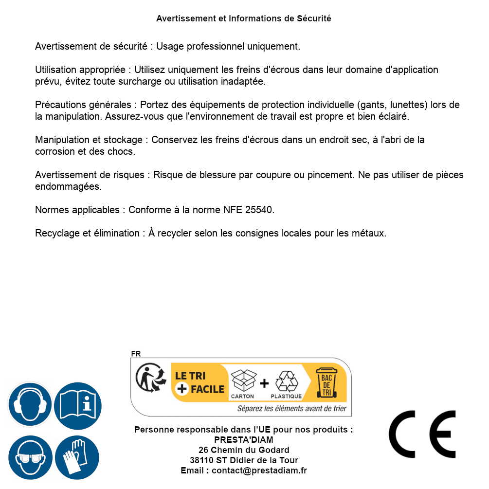| AVERTISSEMENT et SECURITE | Identification de la personne responsable dans l’UE : Nom : PRESTA'DIAM. Adresse : 26 Chemin du Godard, 38110 ST Didier de la Tour (France). Email : contact@prestadiam.fr. |