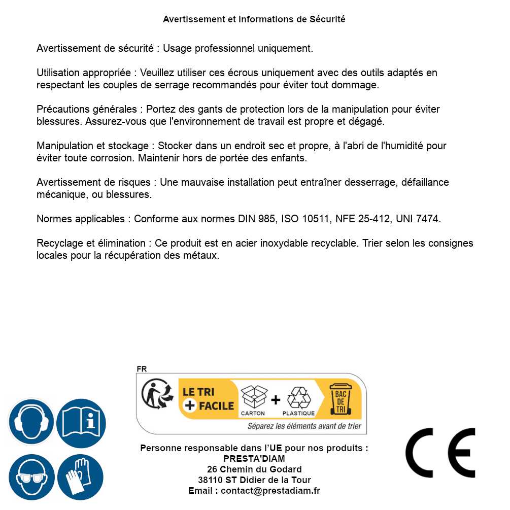 | AVERTISSEMENT et SECURITE | Identification de la personne responsable dans l’UE : Nom : PRESTA'DIAM. Adresse : 26 Chemin du Godard, 38110 ST Didier de la Tour (France). Email : contact@prestadiam.fr. |