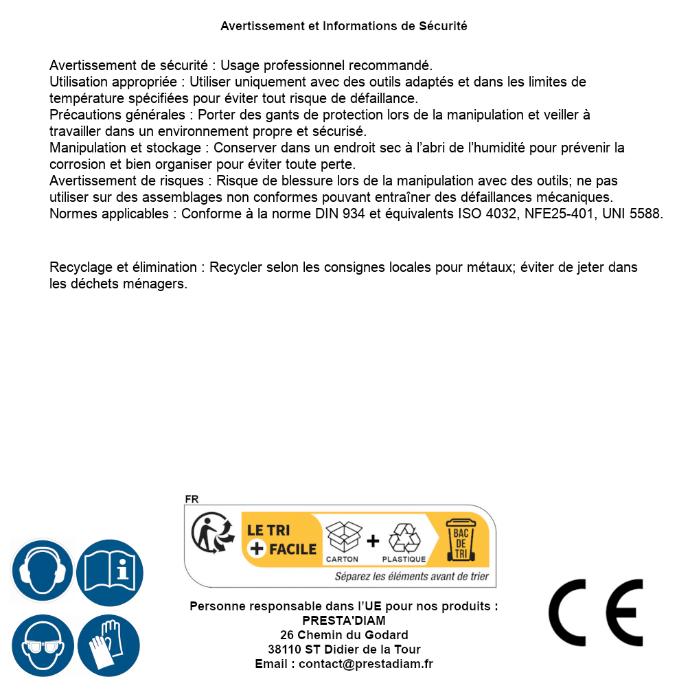 | AVERTISSEMENT et SECURITE | Identification de la personne responsable dans l’UE : Nom : PRESTA'DIAM. Adresse : 26 Chemin du Godard, 38110 ST Didier de la Tour (France). Email : contact@prestadiam.fr. |