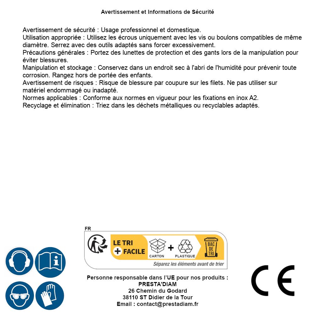 | AVERTISSEMENT et SECURITE | Identification de la personne responsable dans l’UE : Nom : PRESTA'DIAM. Adresse : 26 Chemin du Godard, 38110 ST Didier de la Tour (France). Email : contact@prestadiam.fr. |