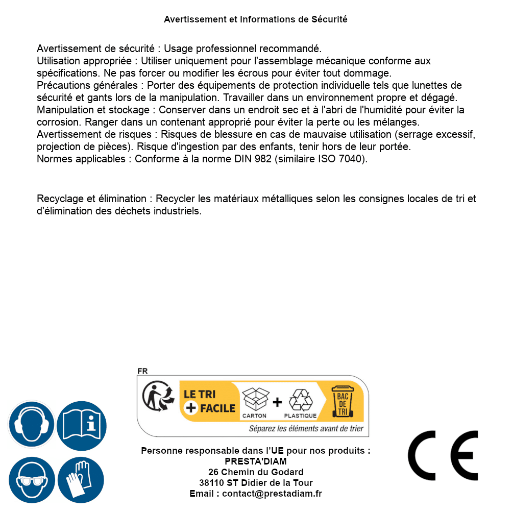 | AVERTISSEMENT et SECURITE | Identification de la personne responsable dans l’UE : Nom : PRESTA'DIAM. Adresse : 26 Chemin du Godard, 38110 ST Didier de la Tour (France). Email : contact@prestadiam.fr. |