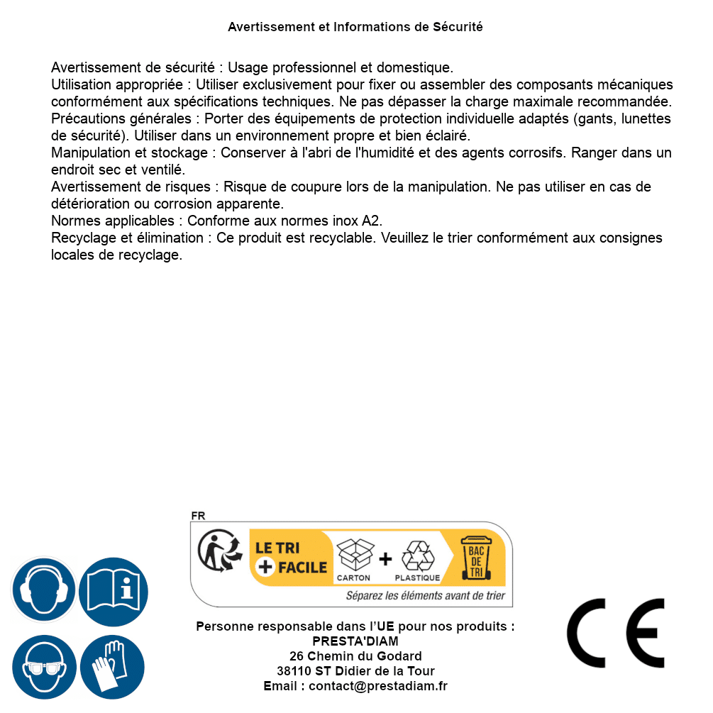 | AVERTISSEMENT et SECURITE | Identification de la personne responsable dans l’UE : Nom : PRESTA'DIAM. Adresse : 26 Chemin du Godard, 38110 ST Didier de la Tour (France). Email : contact@prestadiam.fr. |