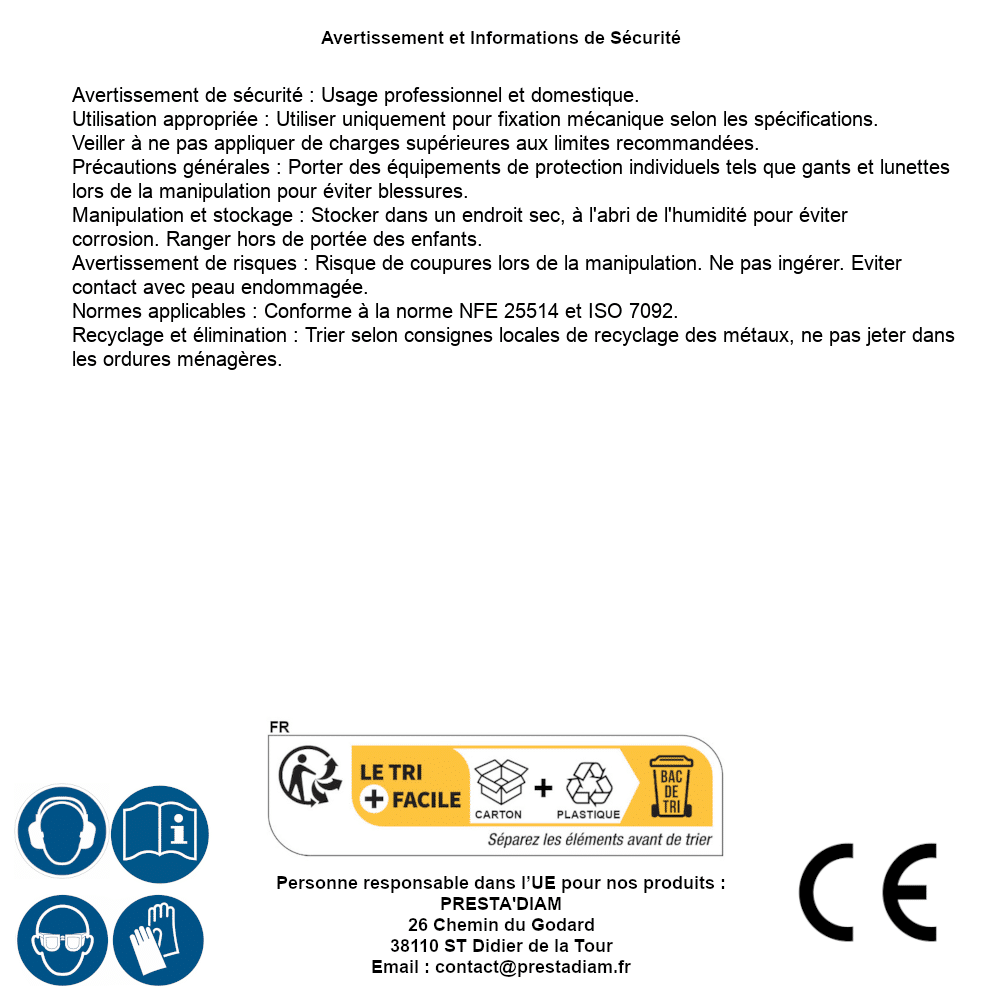 | AVERTISSEMENT et SECURITE | Identification de la personne responsable dans l’UE : Nom : PRESTA'DIAM. Adresse : 26 Chemin du Godard, 38110 ST Didier de la Tour (France). Email : contact@prestadiam.fr. |