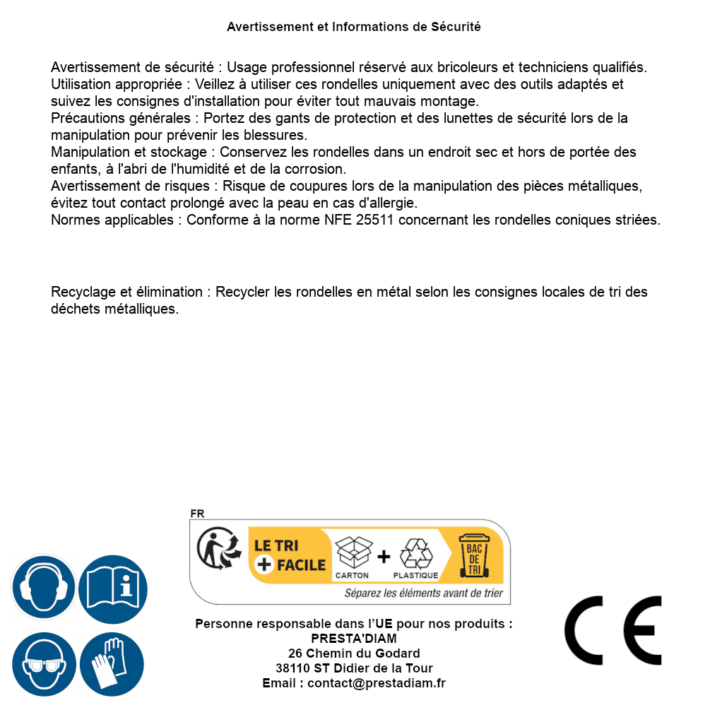 | AVERTISSEMENT et SECURITE | Identification de la personne responsable dans l’UE : Nom : PRESTA'DIAM. Adresse : 26 Chemin du Godard, 38110 ST Didier de la Tour (France). Email : contact@prestadiam.fr. |