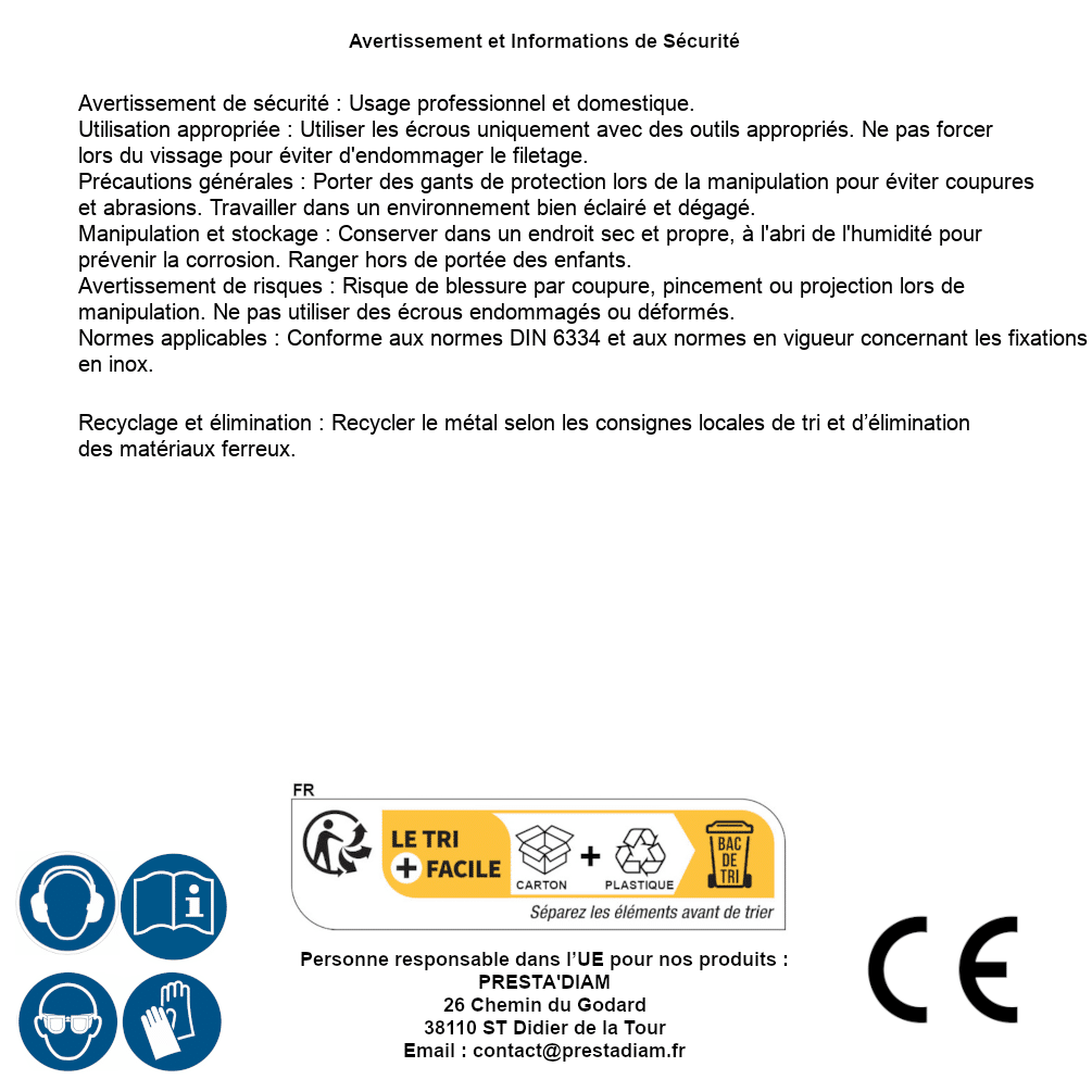 | AVERTISSEMENT et SECURITE | Identification de la personne responsable dans l’UE : Nom : PRESTA'DIAM. Adresse : 26 Chemin du Godard, 38110 ST Didier de la Tour (France). Email : contact@prestadiam.fr. |