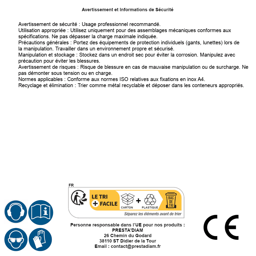 | AVERTISSEMENT et SECURITE | Identification de la personne responsable dans l’UE : Nom : PRESTA'DIAM. Adresse : 26 Chemin du Godard, 38110 ST Didier de la Tour (France). Email : contact@prestadiam.fr. |
