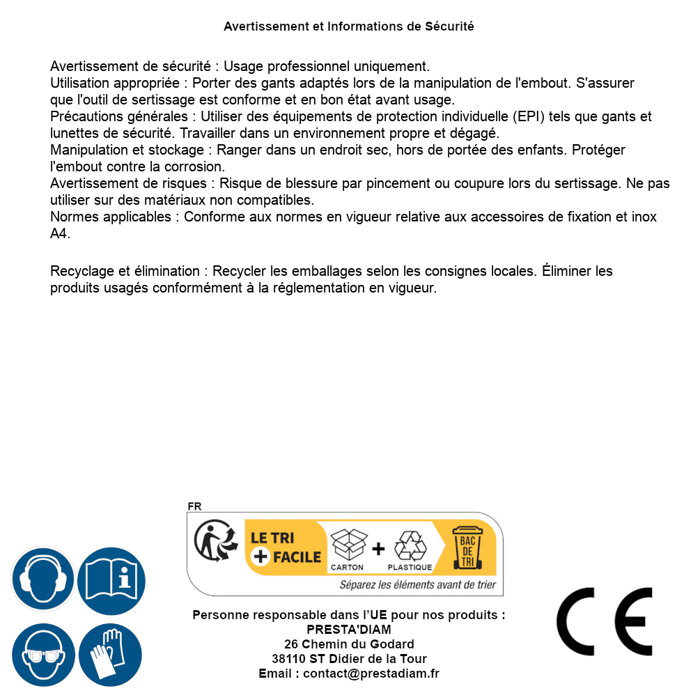 | AVERTISSEMENT et SECURITE | Identification de la personne responsable dans l’UE : Nom : PRESTA'DIAM. Adresse : 26 Chemin du Godard, 38110 ST Didier de la Tour (France). Email : contact@prestadiam.fr. |