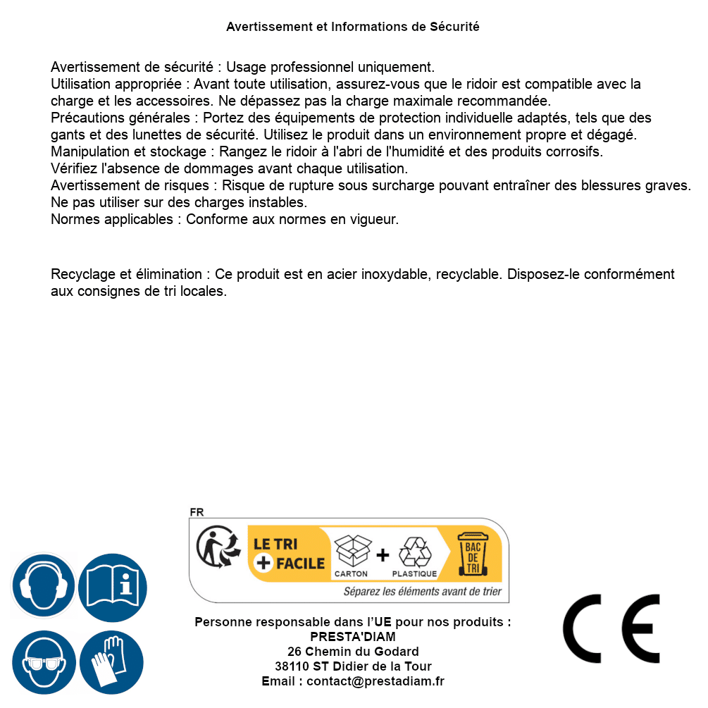 | AVERTISSEMENT et SECURITE | Identification de la personne responsable dans l’UE : Nom : PRESTA'DIAM. Adresse : 26 Chemin du Godard, 38110 ST Didier de la Tour (France). Email : contact@prestadiam.fr. |