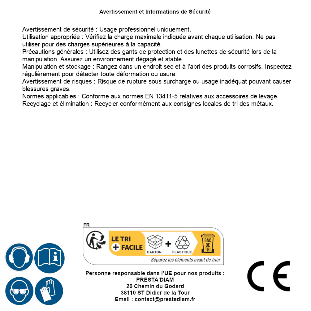 | AVERTISSEMENT et SECURITE | Identification de la personne responsable dans l’UE : Nom : PRESTA'DIAM. Adresse : 26 Chemin du Godard, 38110 ST Didier de la Tour (France). Email : contact@prestadiam.fr. |