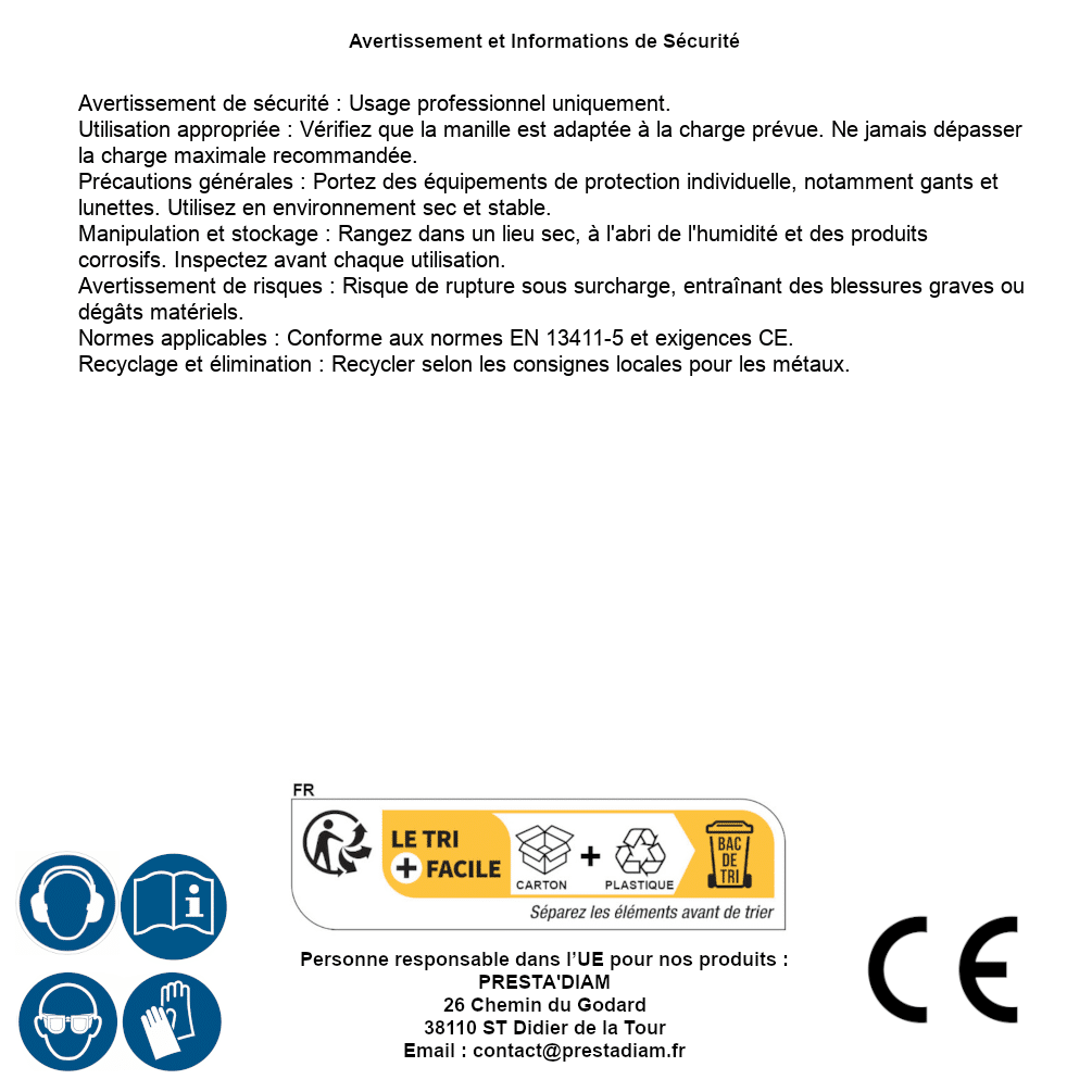 | AVERTISSEMENT et SECURITE | Identification de la personne responsable dans l’UE : Nom : PRESTA'DIAM. Adresse : 26 Chemin du Godard, 38110 ST Didier de la Tour (France). Email : contact@prestadiam.fr. |