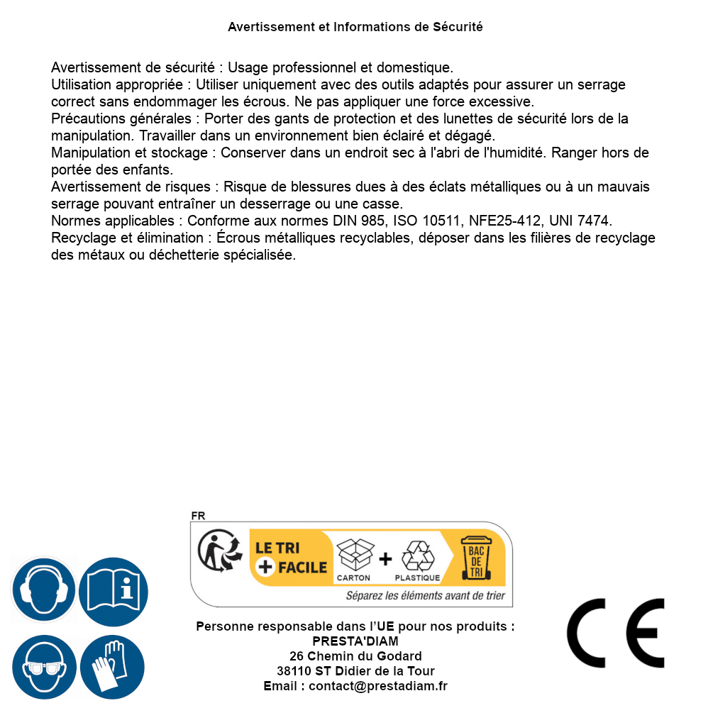 | AVERTISSEMENT et SECURITE | Identification de la personne responsable dans l’UE : Nom : PRESTA'DIAM. Adresse : 26 Chemin du Godard, 38110 ST Didier de la Tour (France). Email : contact@prestadiam.fr. |