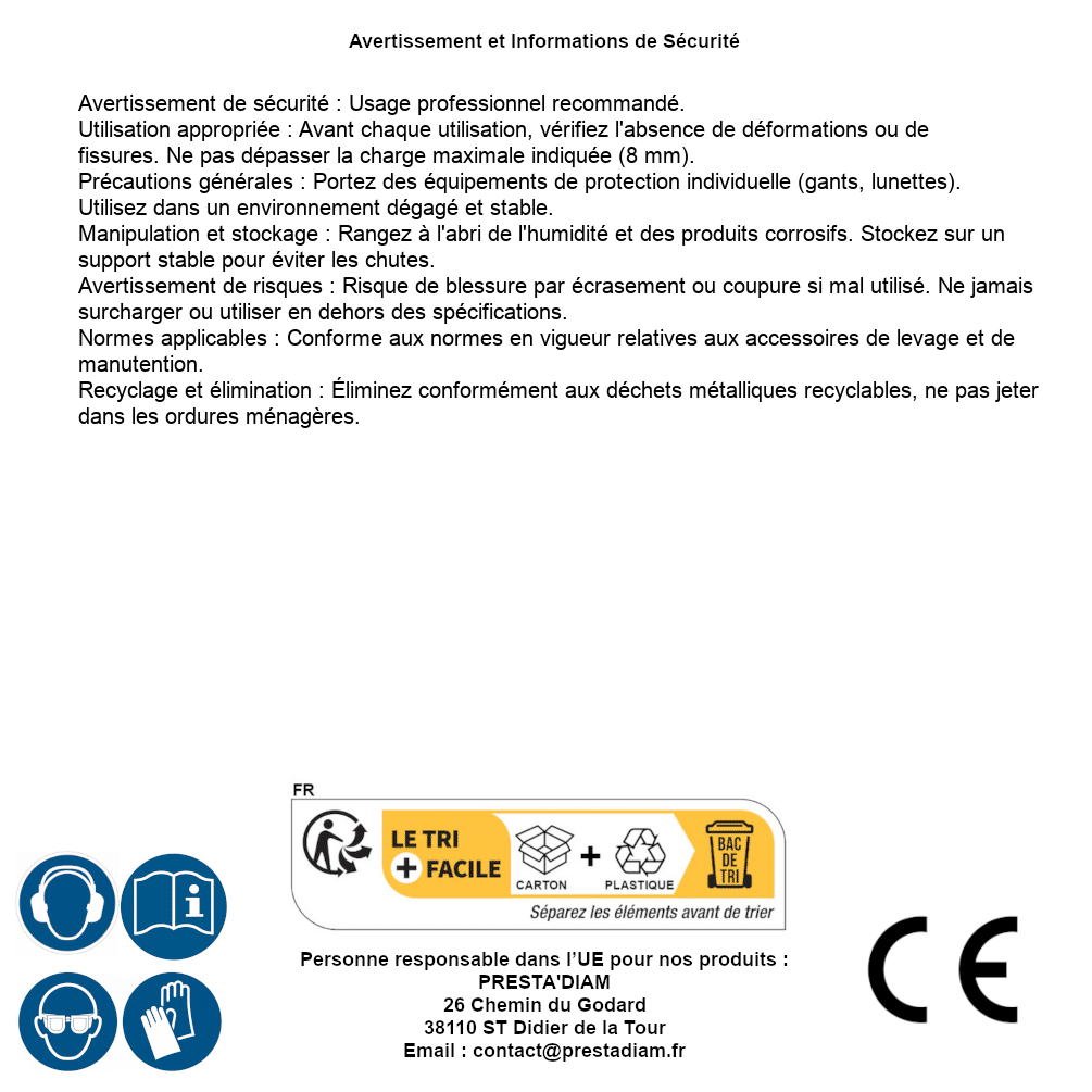 | AVERTISSEMENT et SECURITE | Identification de la personne responsable dans l’UE : Nom : PRESTA'DIAM. Adresse : 26 Chemin du Godard, 38110 ST Didier de la Tour (France). Email : contact@prestadiam.fr. |