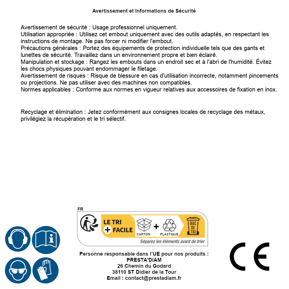 | AVERTISSEMENT et SECURITE | Identification de la personne responsable dans l’UE : Nom : PRESTA'DIAM. Adresse : 26 Chemin du Godard, 38110 ST Didier de la Tour (France). Email : contact@prestadiam.fr. |