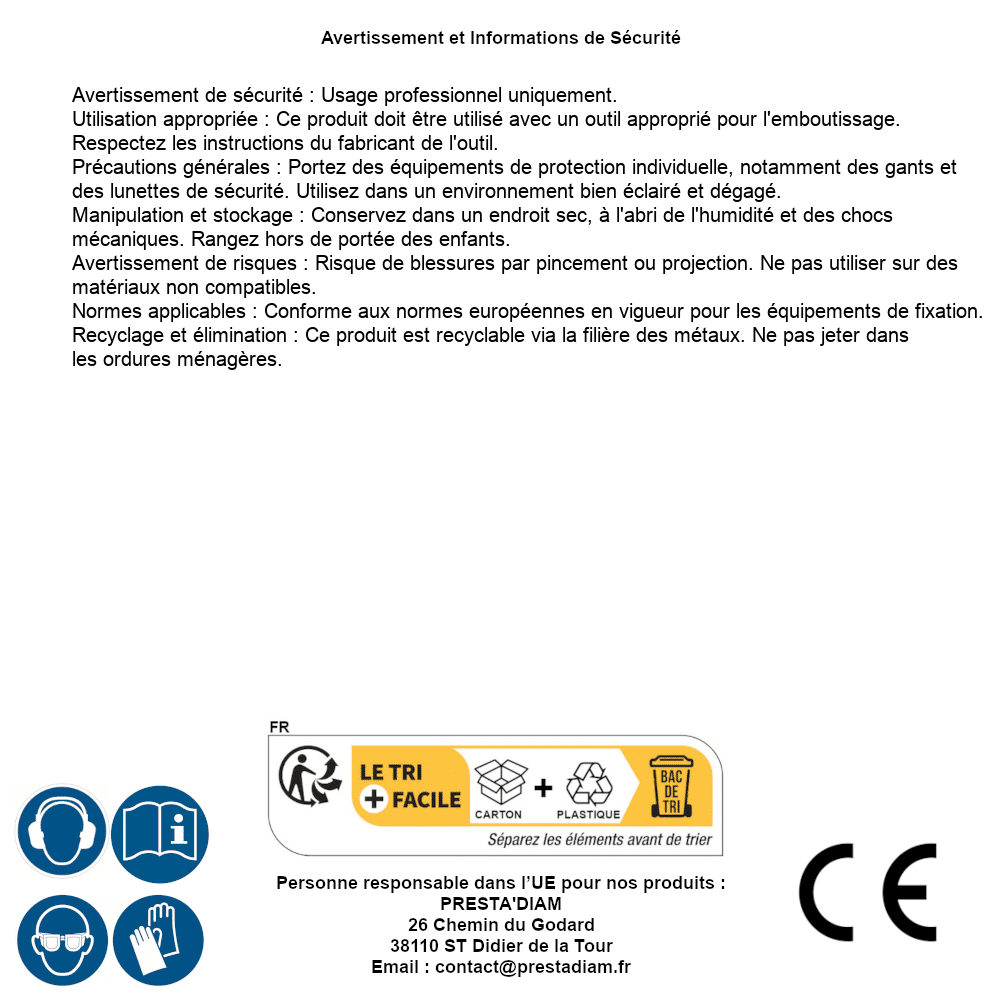 | AVERTISSEMENT et SECURITE | Identification de la personne responsable dans l’UE : Nom : PRESTA'DIAM. Adresse : 26 Chemin du Godard, 38110 ST Didier de la Tour (France). Email : contact@prestadiam.fr. |
