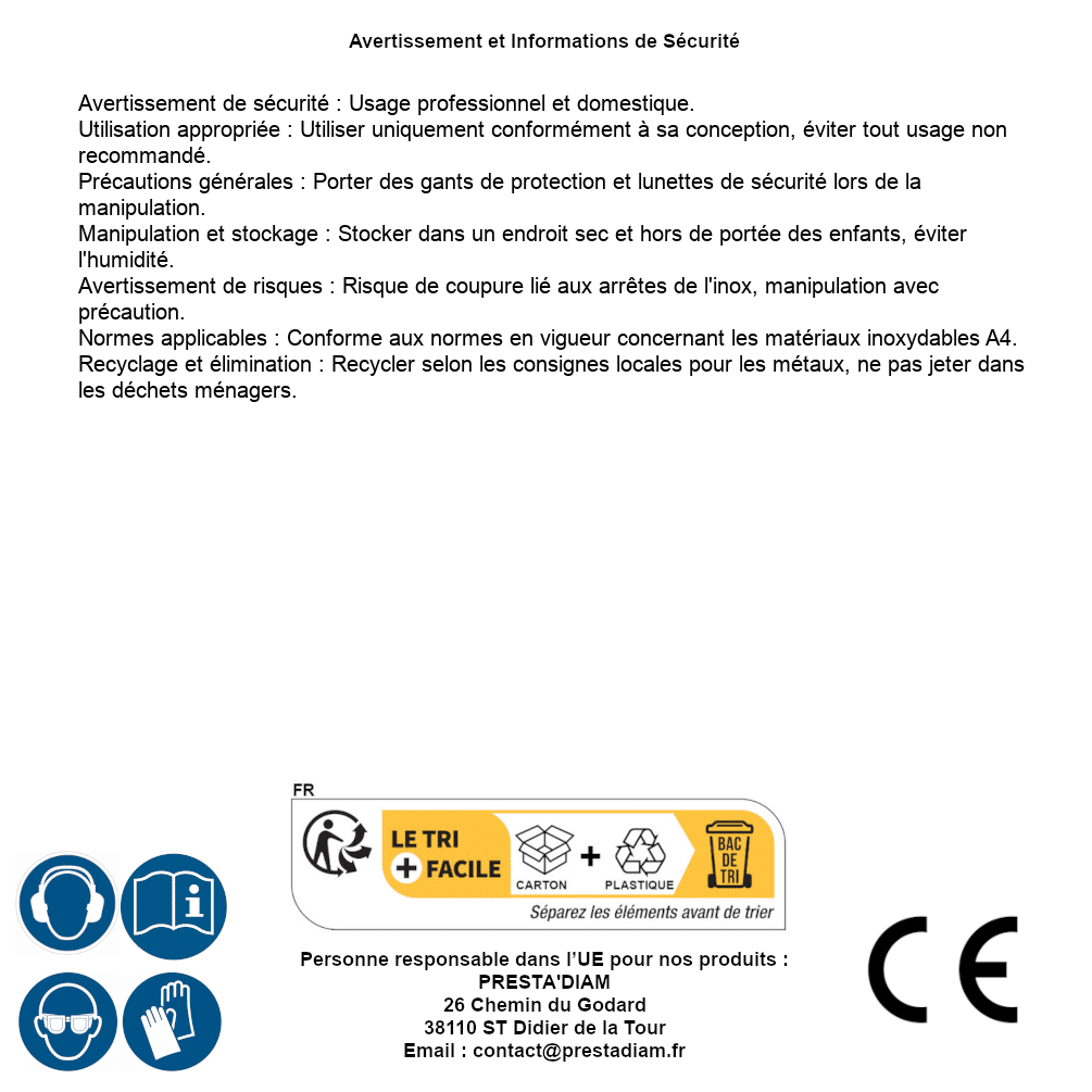 | AVERTISSEMENT et SECURITE | Identification de la personne responsable dans l’UE : Nom : PRESTA'DIAM. Adresse : 26 Chemin du Godard, 38110 ST Didier de la Tour (France). Email : contact@prestadiam.fr. |