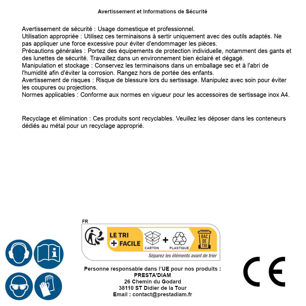 | AVERTISSEMENT et SECURITE | Identification de la personne responsable dans l’UE : Nom : PRESTA'DIAM. Adresse : 26 Chemin du Godard, 38110 ST Didier de la Tour (France). Email : contact@prestadiam.fr. |