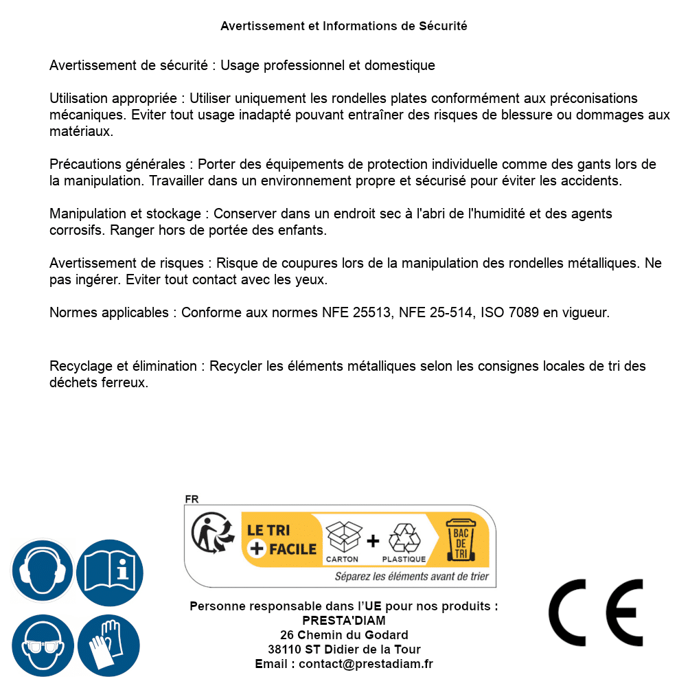 | AVERTISSEMENT et SECURITE | Identification de la personne responsable dans l’UE : Nom : PRESTA'DIAM. Adresse : 26 Chemin du Godard, 38110 ST Didier de la Tour (France). Email : contact@prestadiam.fr. |