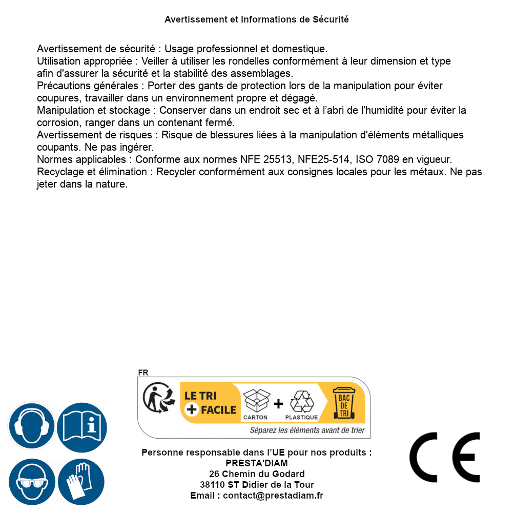 | AVERTISSEMENT et SECURITE | Identification de la personne responsable dans l’UE : Nom : PRESTA'DIAM. Adresse : 26 Chemin du Godard, 38110 ST Didier de la Tour (France). Email : contact@prestadiam.fr. |