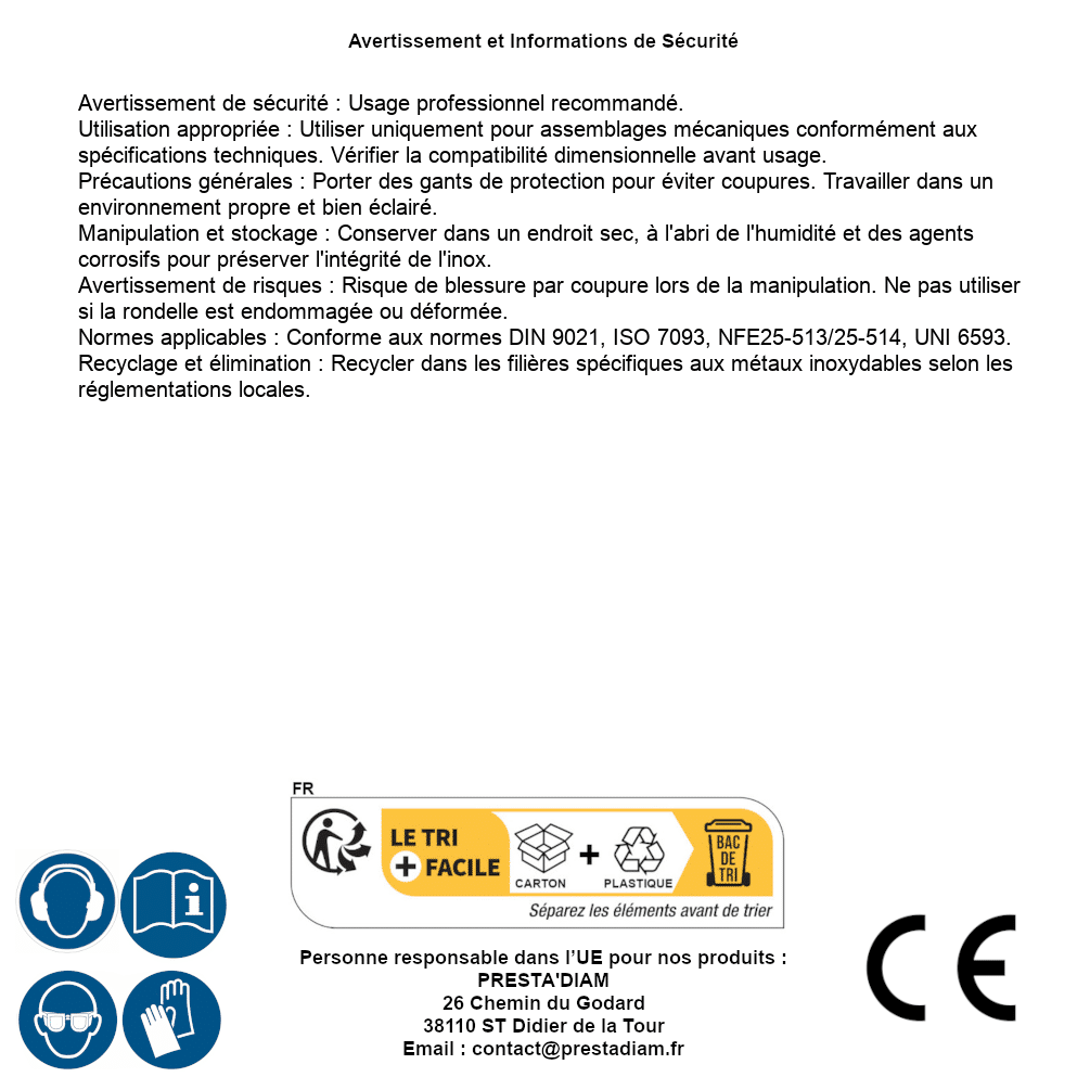 | AVERTISSEMENT et SECURITE | Identification de la personne responsable dans l’UE : Nom : PRESTA'DIAM. Adresse : 26 Chemin du Godard, 38110 ST Didier de la Tour (France). Email : contact@prestadiam.fr. |